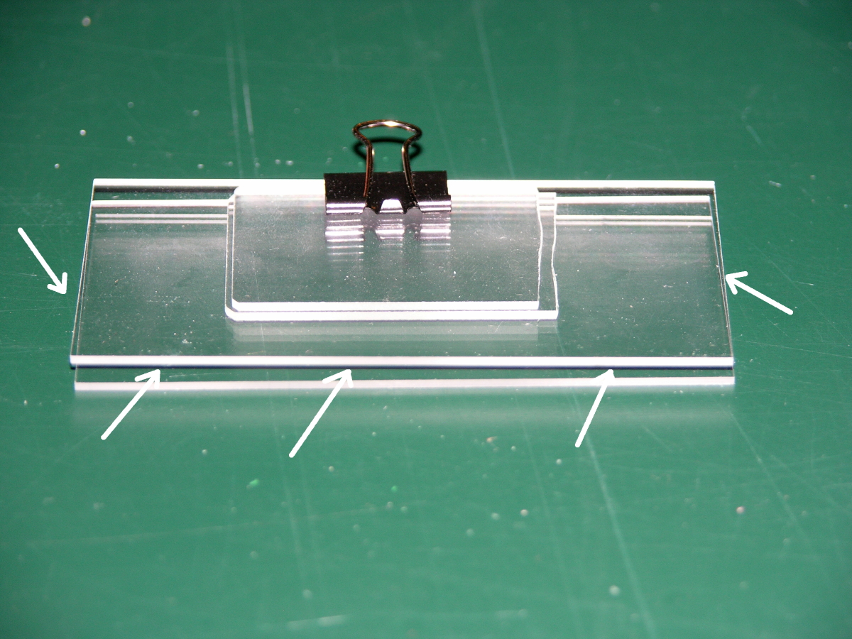 Figure 1. Glass slide “sandwich”. Apply hot glue or clear silicone to seal three sides (arrows).